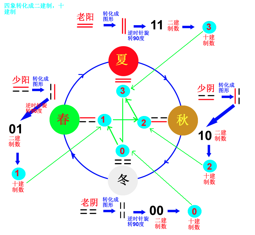 - 四象也可以用季节表示(春:01,夏:11,秋:10,冬:00)