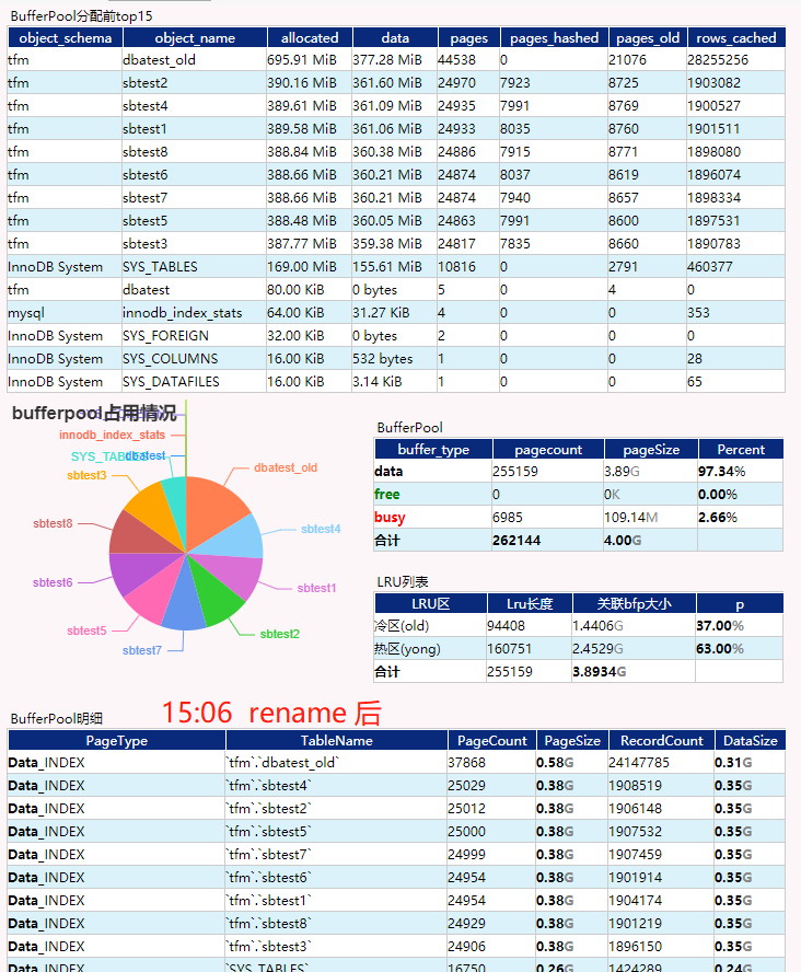 | BufferPool变化 | bufferpool总量变化不大,但是原dbatest_old表占用的空间会显示为找不到表(事实上是spaceid找不到对应的表名),这部分空间不会立即释放,也不能立即被其他正在运行的其他sbtest表占用,会持续很长一段时间,大约10几分钟后,才慢慢的被挤占完。想起一句话,老兵不死,只会慢慢调零。 |